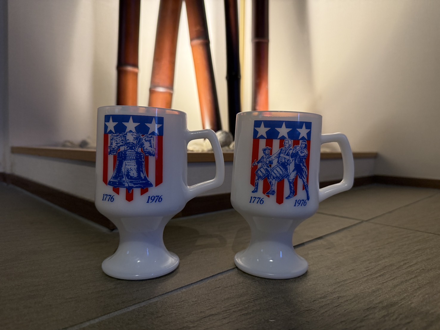 星条旗モチーフのプリントが施された ヴィンテージミルクガラスの脚付きマグ です。